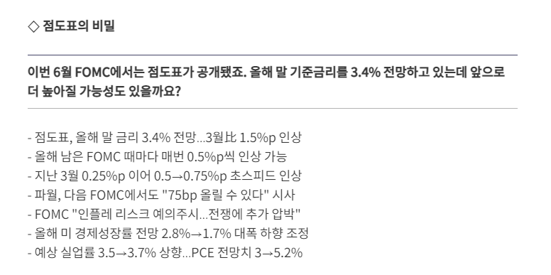 6월 미국금리는 0.75% 상승이라는 28년 만에 최대폭의 자이언트 스텝을 밟았습니다. 미국금리 인상과 관련된 FOMC 회의 이후 여러 가지 기사들이 나오고 있습니다만 그중에서 아래 뉴스 기사에서와 같이 금리관련 내용들을 보게 보면 점도표라는 단어가 나옵니다. 이번 포스팅에서는 점도표가 무엇인지 알아보도록 하겠습니다.